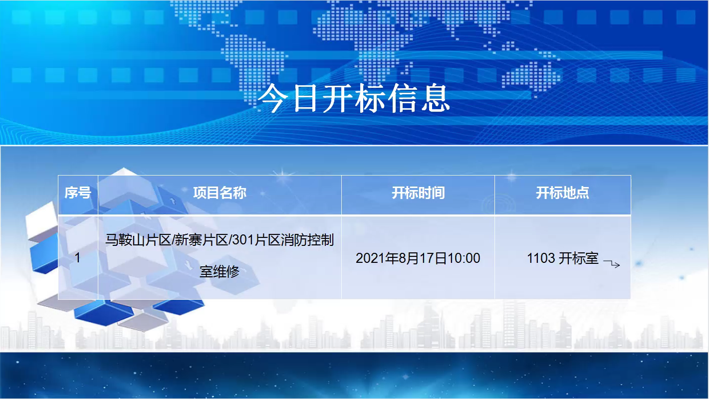 2021年8月17日上午10点,马鞍山片区、新寨片区、301片区消防控制室维修项目在我司开标。