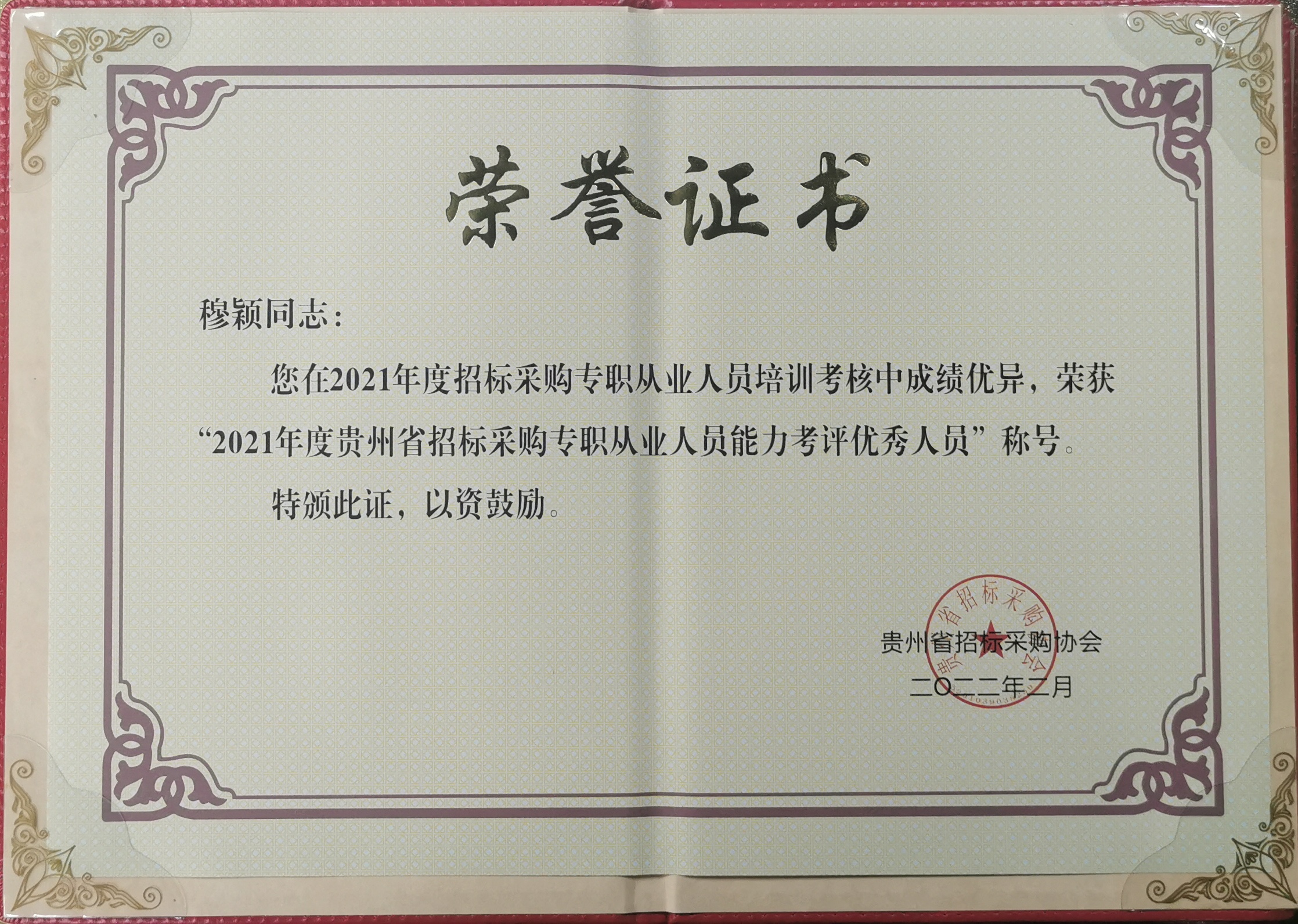 恭喜我司招标采购部穆颖同志因优异的考试成绩和扎实的专业知识,获得贵州省招标采购协会“2021年度贵州省招标采购专职从业人员能力考评优秀人员”称号。 聚力咨询对穆颖同志的此次获奖,表示衷心的祝贺。希望在今后的工作中,戒骄戒躁,再接再厉,发挥榜样力量,带动大家互学共进,不断提高业务素质和专业能力。