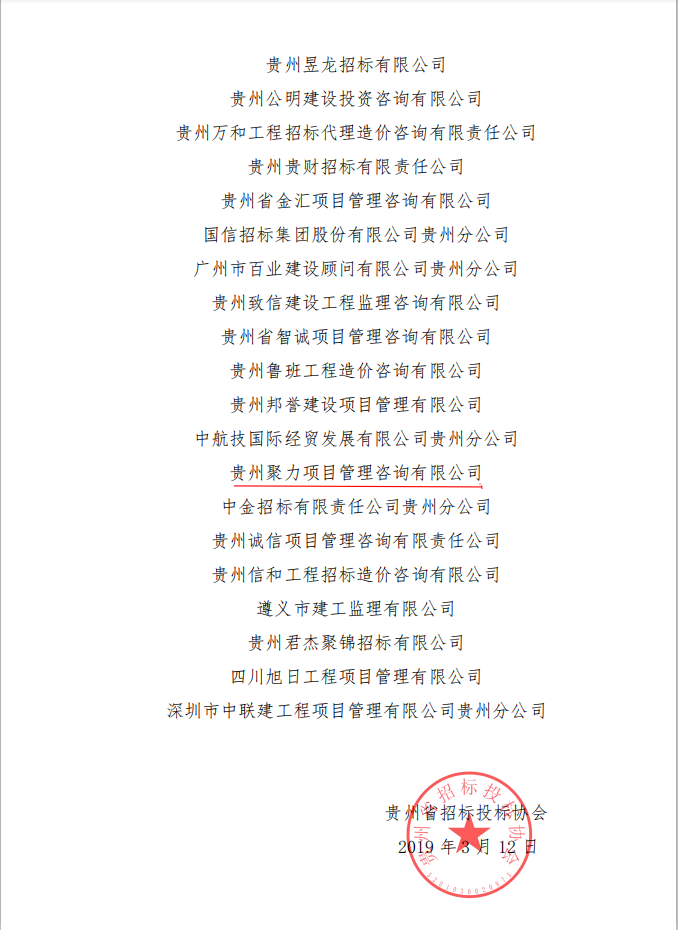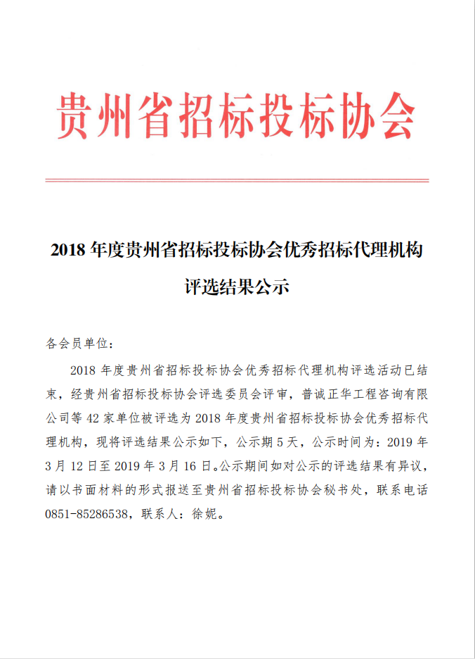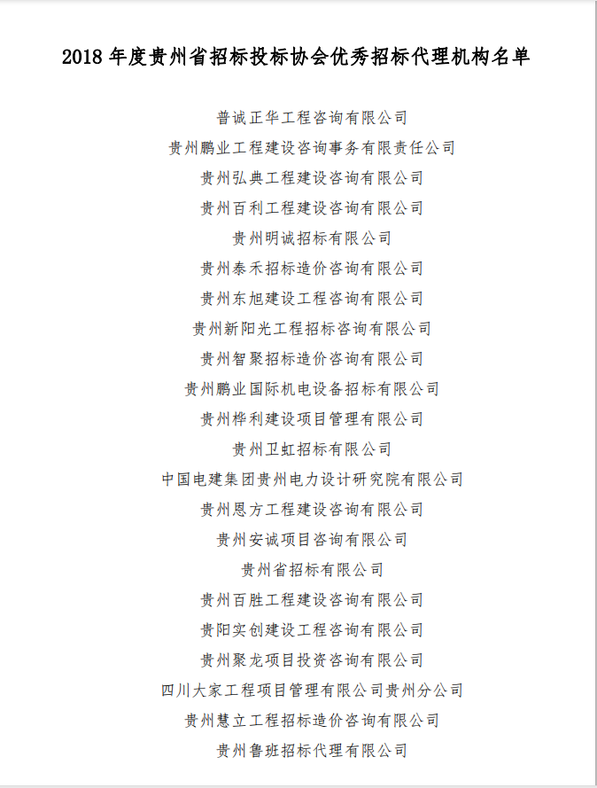 2019年3月12日,贵州省招标投标协会发布了《2018年度贵州省招标投标协会优秀招标代理机构评选结果公示》,此次评选是对我公司招标代理咨询工作的肯定,我们定当再接再厉,争取更大的成绩。